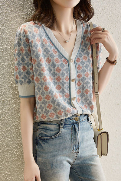 Kardigan Retro Jacquard Damski - Krótki Kamizelka z Dekoltem w Serek, Stylowy i Wygodny