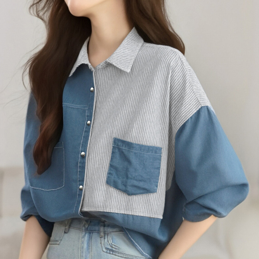 Unikalny wzór patchwork łączy różne odcienie i desenie denimu, co daje efekt ręcznie skrojonego szyku. Detale pasków i kontrastowe elementy dodają ciekawości i przyciągają wzrok. To świetny wybór, jeśli chcesz wyróżnić się na tle klasycznych koszul bez przesadnej ekstrawagancji.