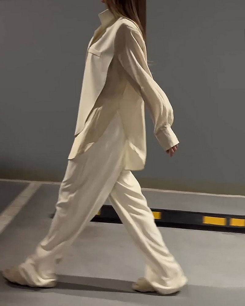 Neutralny kolor i prosty fason pozwalają łatwo łączyć elementy zestawu z różnymi dodatkami. Koszulę i spodnie możesz nosić razem lub osobno, tworząc liczne stylizacje. To ponadczasowy wybór, który zawsze wygląda świeżo i elegancko.